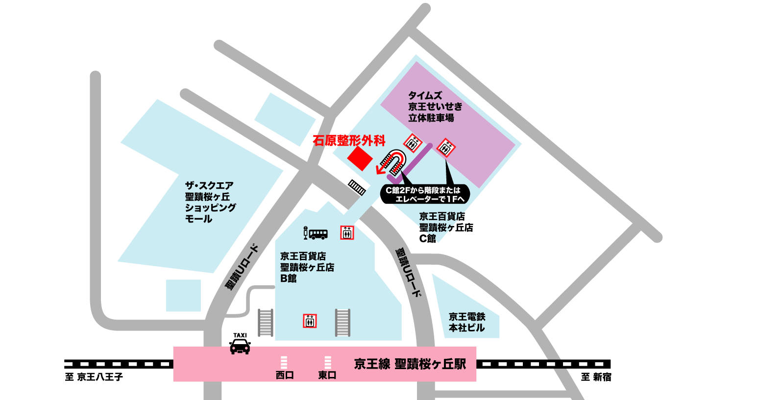 東口・西口どちらの改札からでも、マップに沿ってC館方面へお進みください。
